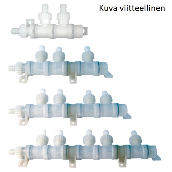 Vesijärjestelmän kaksiosainen jakokappale X-fix -liitännöillä, PE- ja PVC-letkuille.