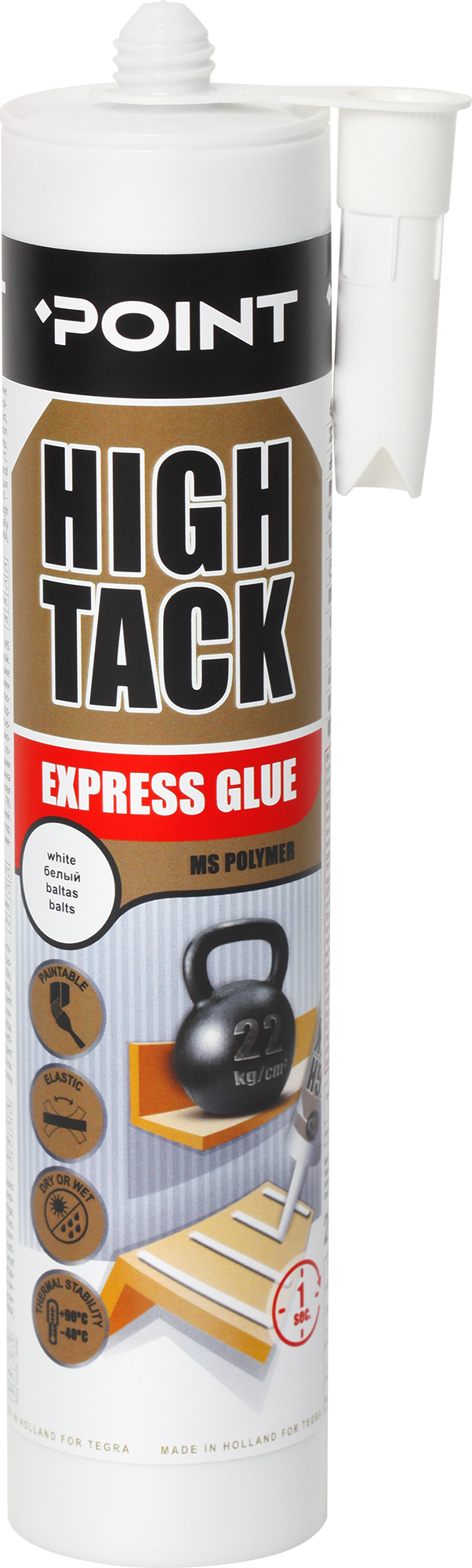 FI Point High Tack on korkealaatuinen MS Polymeeriin perustuva liima, jolla on erittäin korkea alkutartunta. Tarttuu täydellisesti ilman pohjustusainetta useimille, jopa kosteille pinnoille, Elastinen, kutistumaton, ei syövytä metalleja, ei sisällä liuottimia. Pakkasenkestävyys kuljetuksen aikana -15c asti. Käyttöohjeet. Pintojen on oltava puhtaita ja rasvattomia. Levitä liima tiivistyspistoolilla ja mikana toimitetulla V-suuttimella pystysuorina raitoina 10-20 cm välein. Korkean alkulujuuden vuoksi tukea ei yleensä tarvita kovettumisen aikana. Ei sovellu pe-, pp, pc-, pmma-, ptfe-, neopreeni ja bitumipitoisiin alustoihin