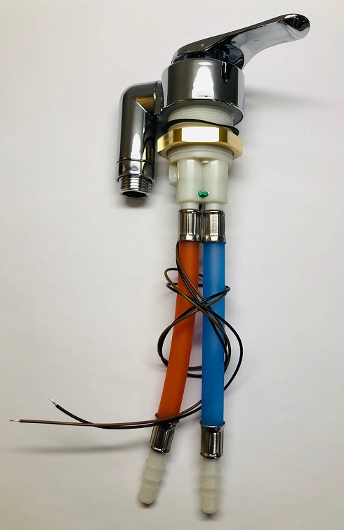 Liitos pöytäpinnan yläpuolella. Kovat liitosputket, letkuliittimet. Katkaisin.