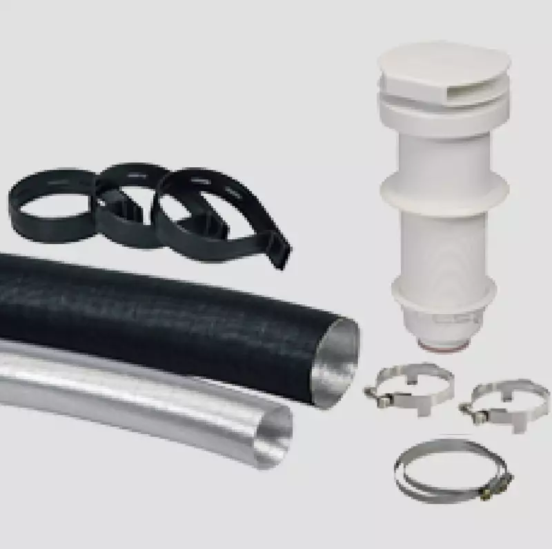 Sarjaan kuuluu kattoläpivienti, pakoputki 3 m, pakoputken suojaputki 3 m ja kiristimet.