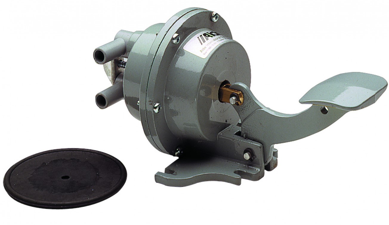 Jalkatoiminen kalvoipumppu puhtaalle vedelle. Valmistettu kevytmetallista.